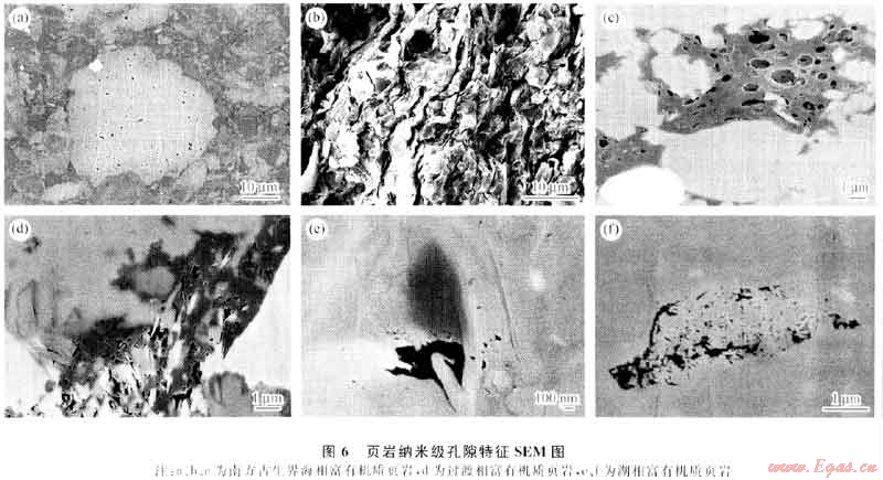露頭與巖心觀察、巖石薄片鑒定與顯微電鏡分析發(fā)現(xiàn),海相富有機(jī)質(zhì)頁(yè)巖微裂縫、基質(zhì)孔隙、有機(jī)質(zhì)孔隙發(fā)育(圖6),孔隙類型豐富,包括無(wú)機(jī)礦物原生粒間孔、自生礦物晶間孔、黏土礦物層間縫、無(wú)機(jī)礦物顆粒次生溶蝕孔、雜基內(nèi)溶蝕孔、有機(jī)質(zhì)孔隙、構(gòu)造或成巖形微裂縫與層間隙等,有機(jī)質(zhì)孔隙是頁(yè)巖儲(chǔ)層獨(dú)有的一類儲(chǔ)集空間,為有機(jī)質(zhì)生烴所形成。目前研究發(fā)現(xiàn)頁(yè)巖儲(chǔ)集空間以納米級(jí)孔隙為主,裂縫以微裂縫為主。揚(yáng)子地區(qū)下古生界頁(yè)巖樣品壓汞測(cè)試與氬離子拋光電鏡觀察,孔隙直徑介于5~750nm,集中分布在20~80nm,孔喉半徑介于10~30nm,平均為20nm。頁(yè)巖孔隙度介于2%~12%,平均值為4.0%左右,滲透率介于25nD~1.73mD,平均小于100nD。研究還發(fā)現(xiàn)頁(yè)巖孔隙發(fā)育程度受無(wú)機(jī)礦物顆粒粒度與含量、黏土礦物成分與含量、有機(jī)質(zhì)含量、成巖作用等多重因素控制。