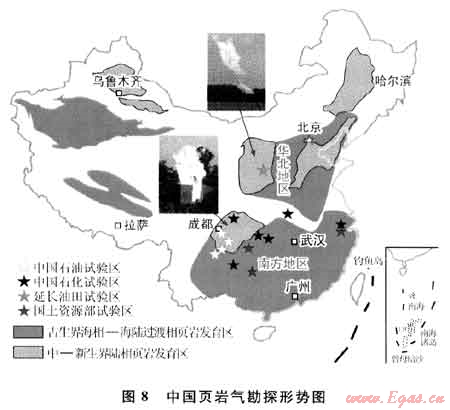 中國(guó)政府對(duì)中國(guó)頁(yè)巖氣勘探給予了高度重視。2009年中國(guó)與美國(guó)簽署了《中美關(guān)于在頁(yè)巖氣領(lǐng)域開展合作的諒解備忘錄》,國(guó)土資源部設(shè)立了“全國(guó)頁(yè)巖氣資源潛力調(diào)查評(píng)價(jià)及有利區(qū)優(yōu)選”重大專項(xiàng);2010年中國(guó)與美國(guó)制訂并簽署了《美國(guó)國(guó)務(wù)院和中國(guó)國(guó)家能源局關(guān)于中美頁(yè)巖氣資源工作行動(dòng)計(jì)劃》、成立了國(guó)家能源頁(yè)巖氣研發(fā)(實(shí)驗(yàn))中心;2011年科技部在油氣重大專項(xiàng)中設(shè)立《頁(yè)巖氣勘探開發(fā)關(guān)鍵技術(shù)》項(xiàng)目,國(guó)家發(fā)展和改革委員會(huì)等多部委聯(lián)合編制了中國(guó)頁(yè)巖氣“十二五”勘探開發(fā)規(guī)劃。目前,中國(guó)已在陸上廣泛開展了頁(yè)巖氣前期地質(zhì)評(píng)價(jià)和勘探開發(fā)先導(dǎo)試驗(yàn),初步明確了上揚(yáng)子區(qū)古生界海相富有機(jī)質(zhì)頁(yè)巖為中國(guó)陸上頁(yè)巖氣勘探最有利領(lǐng)域。據(jù)不完全統(tǒng)計(jì)(圖8),中國(guó)已在陸上四川、鄂爾多斯、渤海灣、沁水、泌陽(yáng)等盆地,云南昭通、貴州大方、建南、銅仁等地區(qū)開展了頁(yè)巖氣鉆探與水力壓裂試氣,完鉆頁(yè)巖氣井35口(其中水平井5口),水力壓裂試氣井14(氣中水平井2口),獲工業(yè)氣(油)流井11口(其中水平井1口),初產(chǎn)超過(guò)1×104m3/d氣井7口。四川盆地、云南昭通實(shí)現(xiàn)了古生界海相頁(yè)巖氣的突破;四川盆地、鄂爾多斯盆地陸相頁(yè)巖氣見(jiàn)到良好顯示;泌陽(yáng)盆地陸相頁(yè)巖油勘探也取得了進(jìn)展。