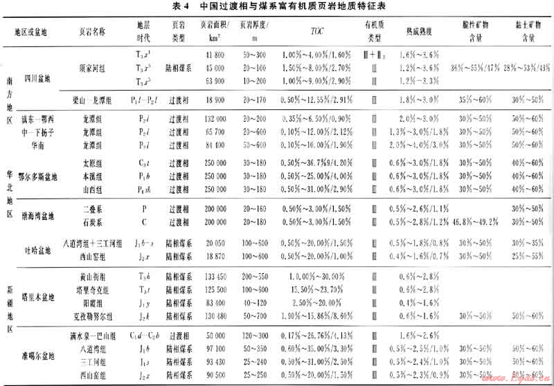 中國(guó)過(guò)渡相與煤系富有機(jī)質(zhì)頁(yè)巖發(fā)育程度、分布范圍與海相富有機(jī)質(zhì)頁(yè)巖相當(dāng)(表4),其差異在于此類頁(yè)巖分布受沉積相帶控制[11],縱橫向變化快,單層厚度小,累計(jì)厚度大。華北地區(qū)石炭一二疊系頁(yè)巖分布面積介于10×104~20×104km2,累計(jì)厚度介于60~200m,最大累計(jì)厚度達(dá)300m;單層厚度介于8~15m,最大單層厚度達(dá)40m。南方地區(qū)二疊系頁(yè)巖分布面積介于20×104~50×104km2,累計(jì)厚度介于10~125m,最大單層厚度達(dá)25m[12]。四川盆地上三疊統(tǒng)、吐哈準(zhǔn)噶爾盆地侏羅系和塔里木盆地侏羅-三疊系湖-沼相煤系頁(yè)巖面積介于28.165×104~31.150×104km2,累計(jì)厚度介于50~1240m,單層厚度介于5~15m,最大單層厚度近50m,縱橫向變化快。
