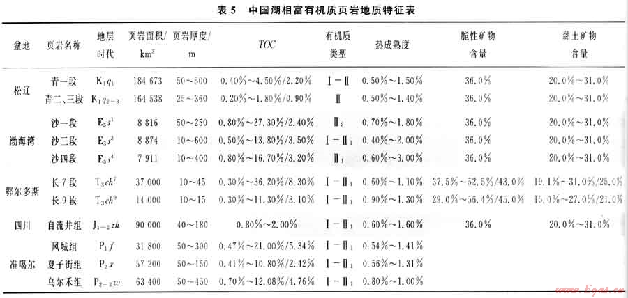 4) 湖相富有機(jī)質(zhì)頁(yè)巖總厚度大,有機(jī)碳含量高,熱成熟度低,頁(yè)巖成巖作用低,黏土礦物中水敏礦物含量多,有利區(qū)以盆地中心或埋深較大地區(qū)為主,開采技術(shù)要求高。