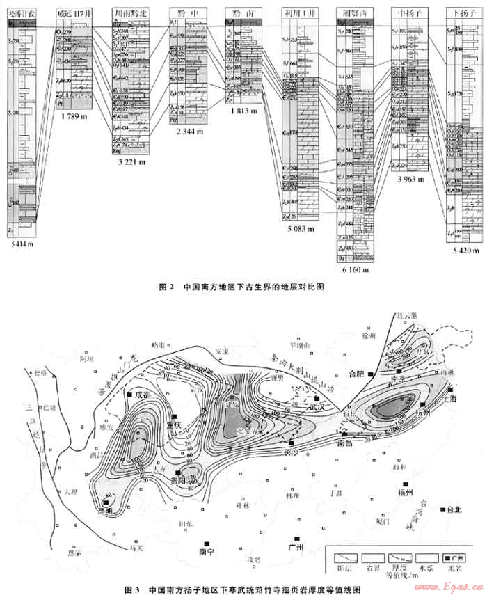 —O1s)。揚(yáng)子地區(qū)的寒武系頁(yè)巖形成于早寒武世,厚度大,分布范圍遍及整個(gè)揚(yáng)子地臺(tái)區(qū)(圖3),是麻江、凱里等古油藏及威遠(yuǎn)氣田的主要烴源巖。塔里木盆地寒武紀(jì)在早期和晚期各發(fā)育一套頁(yè)巖,在柯平、塔里南、塔中隆起、塔北隆起、滿加爾坳陷等區(qū)域廣泛分布,是塔里木盆地的重要烴源巖。志留紀(jì)頁(yè)巖在揚(yáng)子地區(qū)發(fā)育較好,以早直留世龍馬溪組頁(yè)巖為主,分布于整個(gè)揚(yáng)子地區(qū)(圖4),是四川盆地五百梯、羅家寨、建南等石灰系氣田的主力烴源巖。此外,在鄂爾多斯盆地西緣、塔里木盆地還發(fā)育有中-上奧陶統(tǒng)平?jīng)鼋M(O2p)、印干組(O3y)頁(yè)巖,在黔南-桂中地區(qū)發(fā)育有泥盆系印堂-羅富組(D2-3y-l)頁(yè)巖,在滇東北發(fā)育了石灰系舊司組(C1j)頁(yè)巖。