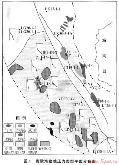 3) 壓力傳遞作用。處在盆地邊緣的鶯北臨高區(qū)和鶯東斜坡區(qū),本身深部地層的壓力系數(shù)就屬于正常壓力-壓力過(guò)渡區(qū)間,再加上沉積物較粗,易于泄壓,其深部地層的壓力沒(méi)有在淺層聚集;而樂(lè)東底辟區(qū)則處于剛結(jié)束的排壓期,裂隙和斷層處在封閉狀態(tài),難于將深部地層的高壓傳遞到淺部地層。
