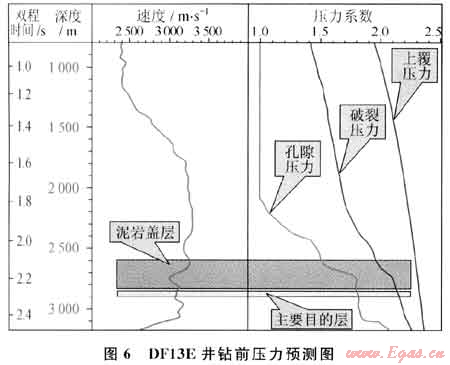 對(duì)東方1-1三維地震資料進(jìn)行精細(xì)研究[18~19],在東方氣田西翼發(fā)現(xiàn)黃流組一段大型三角洲體系,落實(shí)一群巖性圈閉,經(jīng)過(guò)反復(fù)研究和論證,鉆探DF13E井(圖5),該井鉆探目的為探索黃流組一段上部砂體含油氣性和儲(chǔ)量規(guī)模;獲取東方1-1構(gòu)造西塊中層的儲(chǔ)層物性、油氣層流體性質(zhì)及產(chǎn)能資料。該井鉆遇的蓋層與DF11C井和DF11D井的明顯不同,該井位于東方底辟構(gòu)造西側(cè)、底辟背斜之外,鉆探結(jié)果在黃流組一段上部揭示了一套厚達(dá)220m的海侵-高位體系域淺海泥巖蓋層,這套直接蓋層不僅厚度大,而且泥巖純,塑性強(qiáng)(可鉆性差),受壓實(shí)程度較高,分布范圍較廣,具有超壓(壓力系數(shù)為1.5~1.8)(圖6),表現(xiàn)出良好的高壓封蓋性能,為異常高壓氣藏的形成提供了重要保障。
