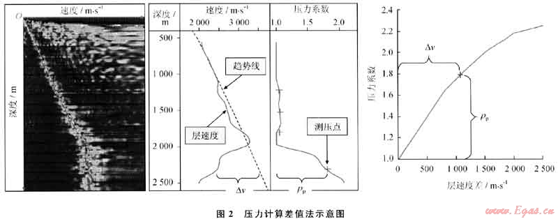 目前地層壓力預(yù)測(cè)的方法較多,但大多數(shù)都屬于經(jīng)驗(yàn)公式的方法,受到一定的適用條件的限制。地層速度是用于地層壓力鉆前預(yù)測(cè)和鉆后壓力計(jì)算的主要參數(shù),層速度特點(diǎn)是在正常壓實(shí)的地層中其值隨深度的增大而增大,而在異常超壓地層中其值比正常值小,因此可憑借層速度的異常變化來(lái)判斷和檢測(cè)異常高壓地層[7~1O]。經(jīng)過(guò)多年對(duì)鶯歌海盆地壓力預(yù)測(cè)及計(jì)算方法研究,發(fā)現(xiàn)“差值法”(圖2)可以應(yīng)用于鶯歌海盆地壓力計(jì)算,其基本原理是用速度異常量來(lái)確定異常壓力。其標(biāo)準(zhǔn)為:△v=0為正常壓實(shí)地層;△v<0為異常高壓力地層。該方法需要在地區(qū)性的壓力預(yù)測(cè)數(shù)學(xué)模型的基礎(chǔ)上定量地計(jì)算出孔隙壓力,其優(yōu)點(diǎn)是不需要先計(jì)算上覆壓力,減少誤差和一些不可控因素。對(duì)于這一方法而言,速度差與壓力系數(shù)對(duì)應(yīng)的壓力預(yù)測(cè)模型的確定是其中的難點(diǎn)和重點(diǎn)。