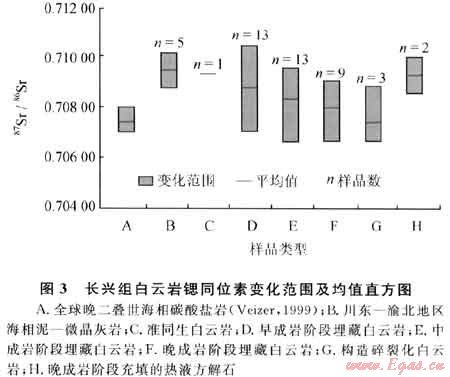 46件樣品的鍶同位素地球化學特征有如下基本特點:①正常海相泥 微晶石灰?guī)r87Sr/86Sr比值為0.708742~0.710519,平均值為0.709447,明顯高于全球晚二疊世海水[17]和上揚子同期海相碳酸鹽巖87Sr/86Sr比值[18],原因可能與石灰?guī)r中含有微量富87Sr的泥質(zhì)組分有關(guān),據(jù)其Mn/Sr比值僅為0.036,而Sr的平均豐度高達0.889‰,反映其未遭受較強的成巖蝕變作用,因此,這一較高的87Sr/86Sr比值仍可作為判斷白云巖鍶同位素地球化學特征的對比標準(圖3);②準同生白云巖87Sr/86Sr比值與泥-微晶灰?guī)r較接近并顯著地高于各成巖階段埋藏白云巖(表1、圖3),說明準同生白云巖化流體源于同期海源水;③長興組成巖白云巖87Sr/86Sr比值遠低于同期海相泥微晶石灰?guī)r,而與飛仙關(guān)組成巖白云巖相似且具有相同的分布規(guī)律,為確定長興組成巖期埋藏白云巖化流體主要來源于飛仙關(guān)組封存的高Mg鹵水提供了依據(jù)[18];④在高Mg鹵水交代長興組海相石灰?guī)r的白云巖化過程中,因長興組海相石灰?guī)r本身所具有相對較富87Sr的性質(zhì)(與其含有微量富87Sr的泥質(zhì)組分有關(guān)),致使交代成因的長興組埋藏白云巖也具有比飛仙關(guān)組略高的87St/86Sr值,但隨著交代過程中87Sr消耗量加大,流體中87Sr濃度逐漸降低,因而出現(xiàn)伴隨成巖強度加大白云巖87St/86Sr比值在各成巖階段中依次降低的變化趨勢(圖3);⑤充填中、晚成巖階段溶蝕孔、洞、縫的熱液方解石87St/86Sr比值略低于海相泥-微晶石灰?guī)r和準同生白云巖,但高于埋藏白云巖,并以其Sr含量很高和往往與更晚期的次生石英共生的特點,推斷其為含有深部流體加入的混合熱液沉淀物。