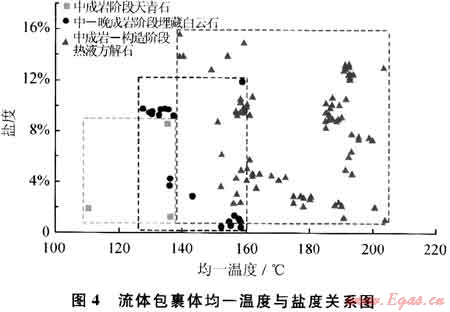 根據(jù)對充填溶蝕孔洞的各成巖階段3類13件次生礦物樣品的流體包裹體測定結(jié)果(圖4):中成巖階段天青石均一溫度為110~136℃,平均值為127℃,鹽度(NaCl質(zhì)量分數(shù),下同)變化范圍為1.23%~8.68%,平均值為3.94%;中-晚成巖階段異形白云石均一溫度介于127~159℃,平均值為143℃,鹽度變化范圍為0.35%~11.93%,平均值為6.8%;晚成巖階段熱液方解石均一溫度介于139~203.8℃,平均值為172℃,鹽度變化范圍為1.23%~15.67%,平均值為8.2%。顯然,上述3類次生礦物都為溫度和鹽度逐漸升高的具熱鹵水性質(zhì)的成巖流體沉淀物。