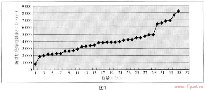 35個(gè)測點(diǎn)的防腐層電阻率從826Ω·m2~8218Ω·m2,管道的外防腐層電阻璋弓啷分在3000Ω·m2~5000Ω·m2,平均值為3996Ω·m2,說明管道防腐層等級基本上為“差”。