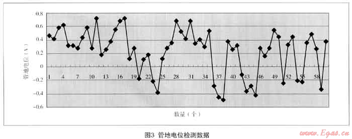 對整體管道的自然電位測試和原犧牲陽極保護(hù)系統(tǒng)進(jìn)行測試,大部分管道處在自然腐蝕電位狀態(tài)(-0.45v,Cu/CuS04參比電極),所測的60處管地電位在-0.49V~-0.72V之間波動(dòng)(見圖3),其中正值占77%,最負(fù)值-0.49V,達(dá)不到管道陰極保護(hù)電位(即管/地界面極化電位)要求的-0.85V,即管道運(yùn)行沒有處于陰極保護(hù)狀態(tài)。