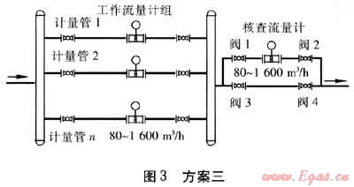 ③ 城市天然氣門站計量系統(tǒng)的設(shè)計方案還要充分考慮城市經(jīng)濟發(fā)展對天然氣供氣設(shè)備擴容的需求。如果選用渦輪流量計或超聲流量計作為工作流量計,則應(yīng)該考慮在圖3方案三的工作流量計組中預(yù)留擴展旁路。如果選用標準孔板流量計作為工作流量計,這種流量計在雷諾數(shù)符合要求的前提下,可以通過擴大開孔直徑、調(diào)整差壓上限等方法,在一定范圍內(nèi)解決擴容的問題。