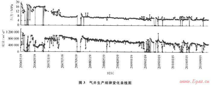 氣井井口流量變化可分為3個階段:①投產(chǎn)初期(一年內(nèi))井口流量變化范圍較大,生產(chǎn)不穩(wěn)定,產(chǎn)氣量為(20~120)×104m3/d;②投產(chǎn)第二年和第三年,生產(chǎn)較為穩(wěn)定,產(chǎn)氣量為(20~80)×104m3/d;③從投產(chǎn)第四年至今,產(chǎn)氣量穩(wěn)定在(15~60)×104m3/d。