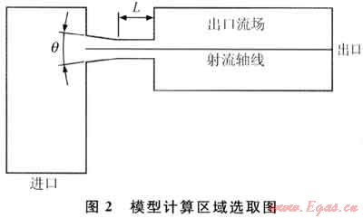運(yùn)用Fluent對(duì)9組選定的圓錐收斂型噴嘴進(jìn)行數(shù)值模擬實(shí)驗(yàn),得出噴嘴性能隨內(nèi)部結(jié)構(gòu)變化趨勢(shì),然后在性能較優(yōu)的噴嘴附近再選擇16組噴嘴進(jìn)行數(shù)值模擬。模型計(jì)算區(qū)域選取見(jiàn)圖2。網(wǎng)格劃分:由于模鴦?dòng)?jì)算區(qū)域不大,為了加快網(wǎng)格劃分速度,采用一次性劃分網(wǎng)格,全部采用四邊形網(wǎng)格,共劃分48225個(gè)網(wǎng)格。
