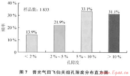 飛一段-飛二段儲(chǔ)層物性普光地區(qū)明顯優(yōu)于元壩地區(qū):普光地區(qū)孔隙度主要介于5%~10%,最大值達(dá)28.86%(圖7),平均值為7.73%,而元壩地區(qū)孔隙度則主要介于2%~5%,最大值為14.15%,平均值為3.12%;元壩地區(qū)65%樣品的滲透率集中分布在小于0.25mD區(qū)間,而普光地區(qū)50%以上樣品的滲透率都大于1mD。