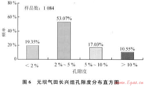對(duì)普光氣田26口井與元壩氣田10口井巖心物性分析樣品統(tǒng)計(jì)的結(jié)果發(fā)現(xiàn),兩地區(qū)飛仙關(guān)組儲(chǔ)層物性差別明顯[5]。長(zhǎng)興組儲(chǔ)層孔隙度、滲透率具有一定的可比性,孔隙度最大值分別為27.9%、24.65%,主要介于2%~5%(圖6),孔隙度介于5%~10%的樣品數(shù)普光氣田略高于元壩氣田,滲透率兩地區(qū)都集中分布在介于0.02~0.25mD與大于1mD區(qū)間。