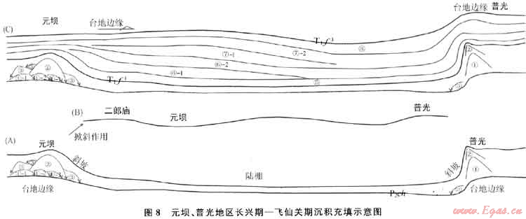 運(yùn)用二維、三維地震資料與鉆井資料相結(jié)合對(duì)元壩、普光地區(qū)長(zhǎng)興組-飛仙關(guān)組沉積時(shí)期沉積充填模式進(jìn)行了分析(圖8),結(jié)果認(rèn)為:兩地區(qū)長(zhǎng)興期沉積主要受早期古地貌控制,元壩地區(qū)長(zhǎng)興組沉積早期由臺(tái)地沉積逐漸演化為深水沉積,坡度緩(僅3°~5°),斜坡寬,這也就造就了早期生屑灘沉積在一個(gè)環(huán)境相似的范圍內(nèi)疊置遷移,灘體發(fā)育面積大,在生物生長(zhǎng)過(guò)程中逐漸形成最為適合生物生長(zhǎng)的位置發(fā)育成為生物礁快速沉積,礁后灘發(fā)育;同時(shí)側(cè)向快速遷移,生物礁分布面積大;而普光地區(qū)長(zhǎng)興組沉積早期,臺(tái)地-斜坡有明顯的坡折,坡度大(15°左右),適合生物生長(zhǎng)的范圍被局限在一定的范圍,礁灘沉積具有垂向加積特征,礁后灘不發(fā)育(圖8)。在地震剖面上元壩地區(qū)發(fā)育前積體,而普光地區(qū)前積體則不發(fā)育。