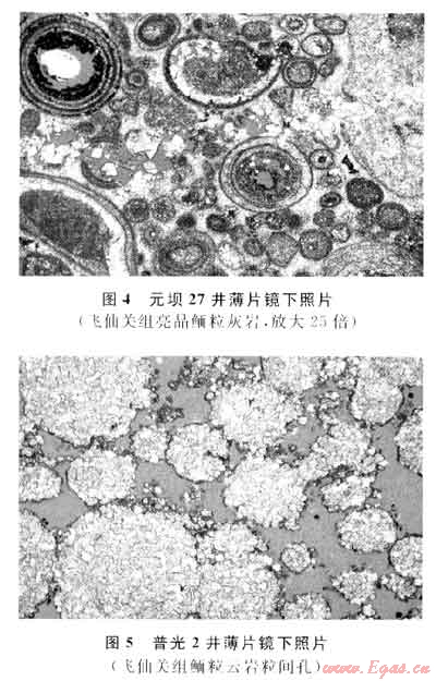 在普光地區(qū)發(fā)育厚層鮞粒灘壩,構(gòu)成普光氣田的主要儲(chǔ)層;而元壩地區(qū)則發(fā)育大片的鮞粒灘,但單層厚度較小,橫向變化快。普光地區(qū)飛一段-飛二段主要由鮞粒云巖、石灰?guī)r組成,飛三段由石灰?guī)r夾膏巖和白云巖組成,儲(chǔ)層主要分布于飛一段-飛二段的鮞粒云巖和粉-細(xì)晶云巖中,儲(chǔ)集厚度大、分布廣、物性好;元壩地區(qū)飛仙關(guān)組以兩個(gè)大的向上變淺的旋回為特征,飛一段-飛三段儲(chǔ)層主要分布在飛二段-飛三段的鮞?;?guī)r中,儲(chǔ)集性能總體較差。