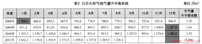 表2是我公司2008年以來4年的每個(gè)月份天然氣購氣量數(shù)據(jù)。其中:藍(lán)色是當(dāng)年最高月份購氣量,黃色是當(dāng)年最低月份購氣量,最后一列是“公司年度天然氣購氣量不平衡系數(shù)”。