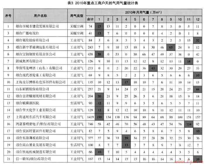 見表3“2010年重點(diǎn)工商戶天然氣用氣量統(tǒng)計(jì)表”。表中:藍(lán)色是年度最高月份用氣量,黃色是年度最低月份用氣量。工商戶最高月用氣量主要集中于1月份及12月份,這些月份正是公司供氣高峰時(shí)期。工商戶最低月用氣量主要集中于7、8月份,而這些月份正是公司供氣量較低的時(shí)間,上述兩個(gè)時(shí)間段直接決定了公司氣量不平衡系數(shù)的大小。多數(shù)工商戶在公司供氣高峰時(shí)也處于供氣高峰期,對公司總氣量不平衡的影響是負(fù)面的,我們稱之為負(fù)面影響氣量用戶。