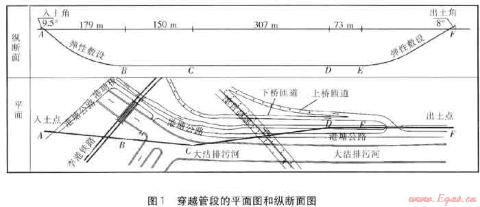 以大沽排污河水平定向鉆穿越工程為例,穿越管段的平面圖和縱斷面圖見圖1。大沽排污河穿越地點位于港塘公路與大沽排污河交口(港塘橋)附近,根據現場踏勘的情況來看,本工程要穿越港塘公路2次(港塘公路在此處為跨河倒“L”形走向)及李港鐵路、大沽排污河、津晉高速上、下橋匝道等幾處地上、地下構筑物。