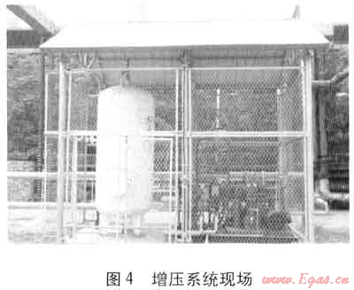 該套系統(tǒng)于2011年8月上旬開始?jí)嚎s機(jī)系統(tǒng)整體成橇和控制系統(tǒng)制作,8月下旬橇體運(yùn)到現(xiàn)場(chǎng)后進(jìn)行管道連接、棚架安裝、電氣安裝,9月初運(yùn)行調(diào)試。經(jīng)過(guò)一段時(shí)間的使用,工作情況保持穩(wěn)定。增壓系統(tǒng)現(xiàn)場(chǎng)見圖4。