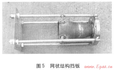 該增壓系統(tǒng)試運(yùn)行時(shí)噪聲較大,主要出現(xiàn)在儲(chǔ)氣罐處。由于現(xiàn)場(chǎng)壓縮機(jī)進(jìn)出口都采用軟管連接,并且噪聲是在增壓的高壓階段出現(xiàn),因此不是振動(dòng)引起。我們對(duì)此進(jìn)行了分析,噪聲可能是由以下原因造成:進(jìn)入儲(chǔ)氣罐的氣流速度過(guò)快,產(chǎn)生了噪聲(聽起來(lái)類似口哨聲),同時(shí)儲(chǔ)氣罐的體積較大且罐壁薄,對(duì)噪聲進(jìn)行了放大。如果能夠分散進(jìn)入儲(chǔ)氣罐的氣流,噪聲可能會(huì)相應(yīng)降低。于是制作了網(wǎng)狀結(jié)構(gòu)的擋板(見圖5)裝于儲(chǔ)氣罐內(nèi)部進(jìn)氣口處。安裝完成后,經(jīng)過(guò)實(shí)際使用驗(yàn)證,整體噪聲大大降低。