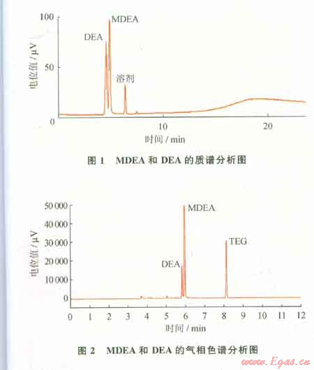 根據(jù)相關(guān)國(guó)家標(biāo)準(zhǔn),測(cè)定MDEA含量可采用酸堿中和滴定法。但混合胺采用此法只能測(cè)定出總胺含量,而對(duì)MDEA和DEA的單獨(dú)含量無(wú)法測(cè)定。采用氣相色譜法可以簡(jiǎn)單、快速、準(zhǔn)確地測(cè)出MDEA和DEA的各自含量[1]。在用氣相色譜儀對(duì)混合溶液進(jìn)行定量之前,先用質(zhì)譜儀對(duì)溶液進(jìn)行定性[2]。