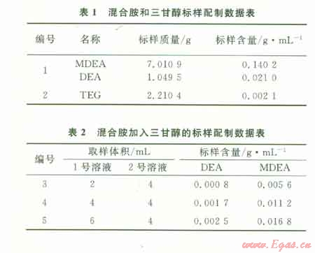 1)加入準(zhǔn)確定量的TEG為參比物,配制一系列標(biāo)準(zhǔn)樣品。以DEA、MDEA色譜峰面積與TEG色譜峰面積的比值為橫坐標(biāo),以標(biāo)準(zhǔn)樣品的濃度為縱坐標(biāo)作圖,得到線性方程。