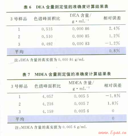 由表6、7可以看出DEA含量測(cè)定值的相對(duì)誤差是0.8%,MDEA含量測(cè)定值的相對(duì)誤差是0,表明該方法的準(zhǔn)確度較高。