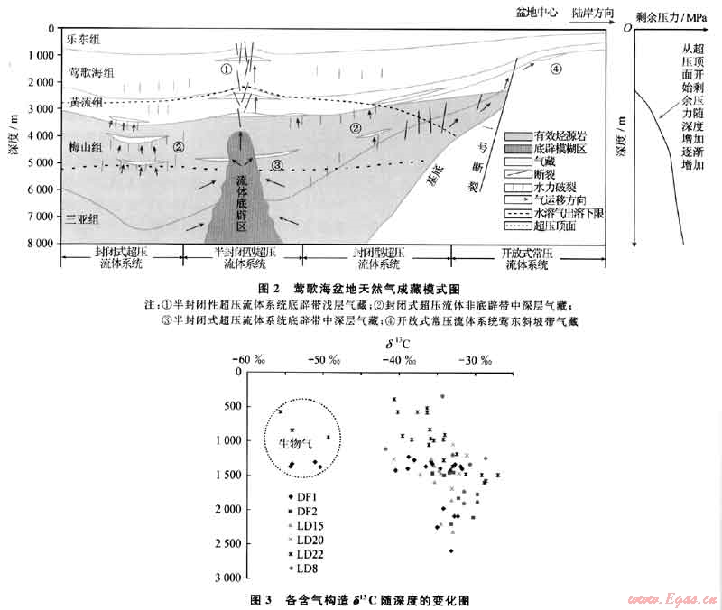 在中中新世以泥底辟為主的演化階段,地層超壓是盆地區(qū)域上壓實(shí)不均衡和三亞組大量生烴所導(dǎo)致,天然氣的有利充注部位為位于壓力過(guò)渡帶和常壓帶的中中新世背斜構(gòu)造。在晚中新世-第四紀(jì)以熱流體底辟為主的演化階段,盆地超壓體系的形成是不均衡壓實(shí)、三亞組生成的無(wú)機(jī)C02以及梅山組大量生烴所導(dǎo)致,天然氣的有利充注部位為位于壓力過(guò)渡帶和常壓帶的上新世鶯歌海組背斜構(gòu)造。