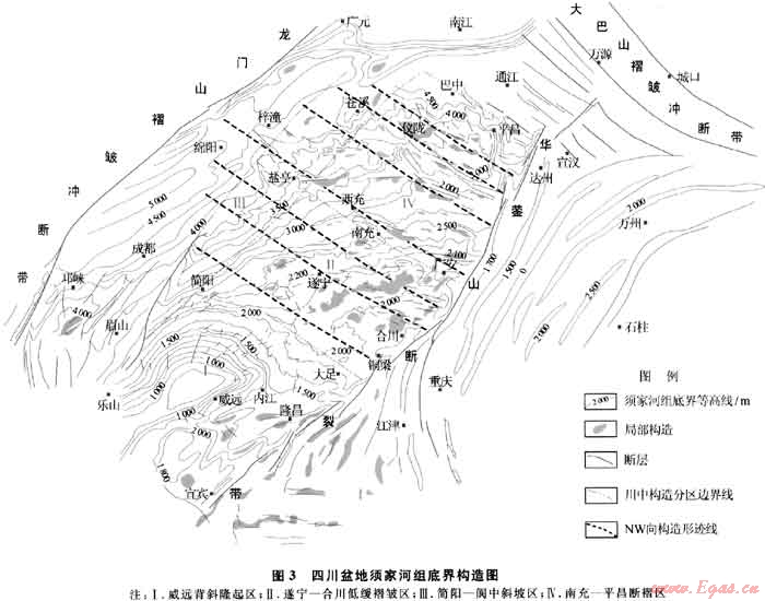 勘探已證實(shí)四川盆地須家河組天然氣資源豐富,以致密砂巖氣藏為主,含氣面積大、儲(chǔ)量規(guī)模大,同時(shí)存在含水飽和度偏高、開(kāi)發(fā)動(dòng)用難度大等難題。加強(qiáng)氣水分布主控因素和天然氣富集“甜點(diǎn)”區(qū)塊預(yù)測(cè)是當(dāng)前勘探開(kāi)發(fā)面臨的重要課題。筆者認(rèn)為加強(qiáng)須家河組構(gòu)造研究是解決上述難題的重要途徑。