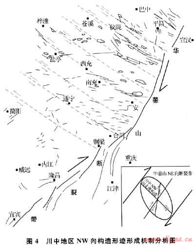 值得指出,川中地區(qū)上述兩種類型的NW向構(gòu)造形跡是疊加在NE向構(gòu)造背景上,其形成時(shí)間應(yīng)是燕山晚期-喜馬拉雅期。
