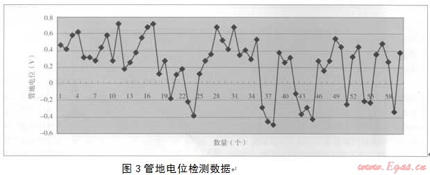 對(duì)整體管道的自然電位測(cè)試和原犧牲陽(yáng)極保護(hù)系統(tǒng)進(jìn)行測(cè)試,大部分管道處在自然腐蝕電位狀態(tài)(-0.45V,Cu/CuS04參比電極),所測(cè)的60處管地電位在-0.49V~-0.72V之間波動(dòng)(見(jiàn)圖3),其中正值占77%,最負(fù)值-0.49V,達(dá)不到管道陰極保護(hù)電位(即管/地界面極化電位)要求的-0.85V,即管道運(yùn)行沒(méi)有處于陰極保護(hù)狀態(tài)。
