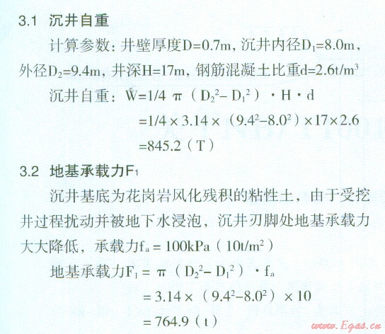 上述簡(jiǎn)單計(jì)算可以看出,沉井白重(W)大于地基承載力(F1)與沉井側(cè)壁摩阻力(F2)之和,所以沉井出現(xiàn)自動(dòng)下沉。