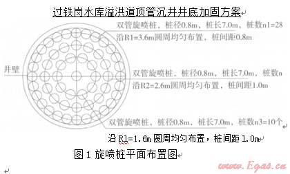 要加同沉井內(nèi)虛土,首先想到的是旋噴樁。眾所周知,旋噴樁是一種適合于加固軟土的很好地基處理方法,但其施工一般是在地面上進(jìn)行。旋噴樁若要在深度達(dá)l7m、而其中上部還要架空約13m的沉井內(nèi)施工卻是從未曾有人嘗試過(guò)。旋噴樁施工隊(duì)伍也擔(dān)心架空l(shuí)3m可能無(wú)法施工、加固效果很難保證。經(jīng)過(guò)仔細(xì)分析,我們大膽提出,只要采取的措施得法,旋噴樁是可以用于加固沉井內(nèi)虛土并起到止水作用的。通過(guò)現(xiàn)場(chǎng)指導(dǎo)施工,落實(shí)各項(xiàng)施工措施,最終證明,旋噴樁加固效果良好,虛土加同后,井底未出現(xiàn)涌砂、涌土現(xiàn)象,順利清除了井底虛土,保證了沉井順利封底。見(jiàn)圖l、圖2。