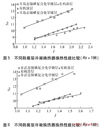 ③ 有機(jī)涂層冷凝換熱器換熱能力在船大時(shí),高于非晶態(tài)鎳磷復(fù)合化學(xué)鍍層冷凝換熱器,是由于有機(jī)涂層可使煙氣在其表面趨于珠狀凝結(jié),改善換熱;在Re小時(shí),換熱能力低于非晶態(tài)鎳磷復(fù)合化學(xué)鍍層冷凝換熱器,是由于形成的液珠在換熱器肋片間搭液橋,使得有機(jī)涂層換熱器換熱能力較低;在Re由大到小的過(guò)程中,兩者的換熱能力相差不大,J越大,有機(jī)涂層冷凝換熱器換熱能力越強(qiáng),回收的潛熱量越多。