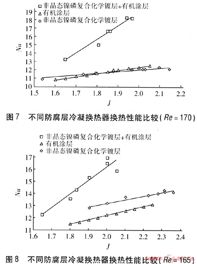 本實(shí)驗(yàn)通過(guò)對(duì)不同防腐層冷凝換熱器換熱性能的測(cè)定得出,冷凝換熱器換熱性能不僅隨Re和J的增大而增強(qiáng),而且對(duì)于不同防腐層的冷凝換熱器,其換熱性能隨Re和J的變化速率也不同;在相同工況下,3種不同防腐層的冷凝換熱器的換熱性能不同,非晶態(tài)鎳磷復(fù)合化學(xué)鍍層+有機(jī)涂層冷凝換熱器換熱能力最強(qiáng),有機(jī)涂層冷凝換熱器換熱能力與非晶態(tài)鎳磷復(fù)合化學(xué)鍍層冷凝換熱器換熱能力相當(dāng)。