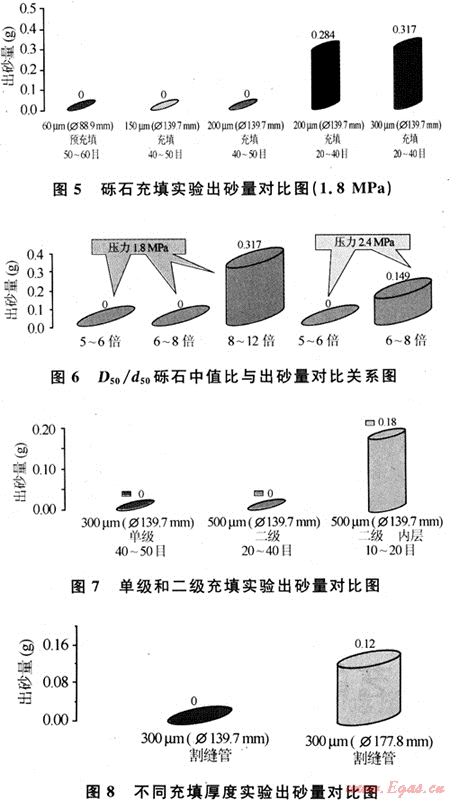 從試驗結(jié)果可以看出:①相同生產(chǎn)壓差下,充填礫石尺寸越大越容易出砂;對于相同尺寸的礫石,降低生產(chǎn)壓差可以減少出砂甚至不出砂;在兩種壓差下,D50/d50比值為5~6倍時,出砂量為零,提高壓差,在不出砂的條件下單位采氣指數(shù)略有增高。②對礫石充填防砂,防砂效果與充填厚度有關(guān),厚度太小或?qū)е路郎笆?,傳統(tǒng)理論認(rèn)為充填厚度應(yīng)大于20mm,盡可能保證充填厚度大于30mm;兩級充填時的防砂效果主要決定于外層礫石,采用多級防砂時,若要防止砂產(chǎn)出,應(yīng)盡可能增加外層礫石的充填厚度。