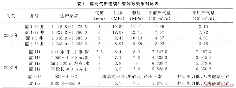 2005年在4口直井、2007年選擇了4口水平井和2口出水較多、有出砂現(xiàn)象的直井實(shí)施了連續(xù)油沖砂作業(yè),其效果見(jiàn)表1。