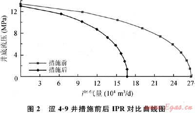 澀4-9井在2003年9月28日實(shí)施高壓一次充填作業(yè),并且分別在防砂前20Q3年8月12日和防砂后2003年11月24日進(jìn)行了產(chǎn)能試井,對試井資料使用一般單點(diǎn)法、指數(shù)式單點(diǎn)法和二次單點(diǎn)法進(jìn)行分析處理,得出措施前后的IPR對比曲線如圖2所示。