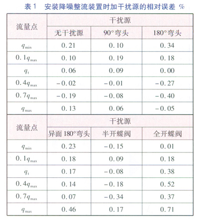 試驗(yàn)的流程為:先在被檢表位置安裝降噪整流裝置和AS超聲波流量計(jì),在無干擾源的情況下進(jìn)行檢定;檢定完成后在降噪整流裝置的上游安裝上干擾源,按照以上流量點(diǎn)再次進(jìn)行檢定。檢定完畢后統(tǒng)計(jì)數(shù)據(jù),進(jìn)行分析,具體數(shù)據(jù)見表1。測(cè)試了常見的5種干擾源,分別為:90°彎頭、180°彎頭、異面180°彎頭、半開的蝶閥、全開的蝶閥。