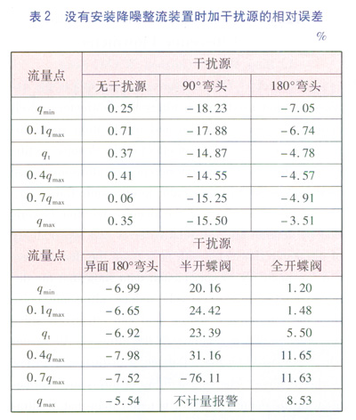 為了使試驗(yàn)結(jié)果更有對(duì)比性和說服力,對(duì)沒有安裝降噪整流裝置的AS超聲波流量計(jì)進(jìn)行了相同的試驗(yàn)。試驗(yàn)完畢后對(duì)數(shù)據(jù)進(jìn)行了統(tǒng)計(jì),具體數(shù)據(jù)見表2。通過數(shù)據(jù)分析,沒有安裝降噪整流裝置的AS超聲波流量汁在以上5種干擾源的環(huán)境下測(cè)量出來的相對(duì)誤差偏離非常大,最大達(dá)到了-76.11%左右。因半開的蝶閥能使氣流的方向傾斜向管壁,對(duì)AS超聲波流量計(jì)的計(jì)量結(jié)果影響最為突出。在檢定qmax流量點(diǎn)時(shí)因受斜向氣流的干擾,AS超聲波流量計(jì)出現(xiàn)了不計(jì)量報(bào)警的異常狀態(tài)。在超聲波流量計(jì)的電子系統(tǒng)中,能有效剔除由混響、電磁干擾等引起的計(jì)量誤差的算法不能消除機(jī)械情況下的干擾引。由此說明降噪整流裝置在整流方面起著決定性的作用。