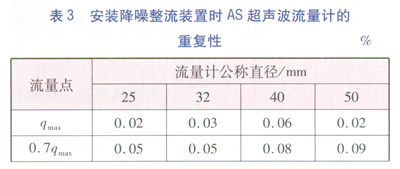 據(jù)國(guó)家質(zhì)量監(jiān)督檢驗(yàn)檢疫總局發(fā)布的超聲波標(biāo)準(zhǔn)JJG 1030—2007《超聲流量計(jì)》的要求,的重復(fù)性不能超過相應(yīng)準(zhǔn)確度等級(jí)規(guī)定的最相對(duì)誤差絕對(duì)值的1/5,即作為1.5級(jí)的AS流量計(jì)的重復(fù)性,除分界流量點(diǎn)(qt)以下的應(yīng)滿足重復(fù)性≤0.6%外,其他流量點(diǎn)應(yīng)滿足≤0.3%。流量計(jì)的重復(fù)性越小,性能越好。析表3和表4中的數(shù)據(jù),安裝降噪整流裝置的As超聲波流量計(jì)的重復(fù)性比不安裝降噪整流裝置的超聲波流量計(jì)的重復(fù)性要小很多,達(dá)到0.5級(jí)AS超聲波流量計(jì)的重復(fù)性的要求。試驗(yàn)證明降噪整流裝置的整流效果在超聲波流量計(jì)的重復(fù)性方面也能體現(xiàn)。