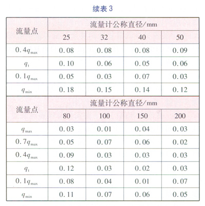 試驗(yàn)的方法為:在標(biāo)準(zhǔn)表校驗(yàn)裝置上被檢表的位置安裝好待測(cè)的儀器后,按照校驗(yàn)流量計(jì)的方法分別對(duì)qmin、0.1qmax、qt、0.4qmax、0.7qmax和qmax的流量點(diǎn)進(jìn)行校驗(yàn)。qmin為流量計(jì)的標(biāo)稱最小流量;qmax為流量計(jì)的標(biāo)稱最大流量;qt為分界流量,即流量范圍被分割成“高區(qū)”和“低區(qū)”的分界點(diǎn)的流量,“高區(qū)”的準(zhǔn)確度等級(jí)為流量計(jì)的標(biāo)稱準(zhǔn)確度等級(jí),“低區(qū)”的準(zhǔn)確度等級(jí)為流量計(jì)的標(biāo)稱準(zhǔn)確度等級(jí)的2倍。