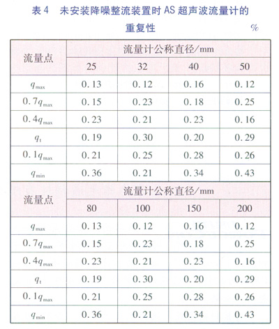為了使得試驗(yàn)結(jié)果更具有對(duì)比性,把各個(gè)口徑的AS超聲波流量計(jì)拆下降噪整流裝置后按照所校驗(yàn)流量點(diǎn)進(jìn)行檢定,并統(tǒng)計(jì)各個(gè)流量點(diǎn)的重復(fù)性,見表4。