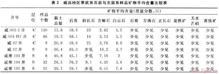 但比較四川盆地寒武系和志留系頁巖,筆者認為,四川盆地頁巖氣勘探開發(fā)的首選目標應為川南志留系,理由如下:①盡管寒武系和志留系烴源巖都有較高的有機碳豐度和較好的有機質(zhì)類型,但志留系烴源巖的成熟度略低于寒武系。②運聚條件不同,志留系烴源巖在川南地區(qū)生烴強度大于川東地區(qū),但在川東地區(qū),石炭系直接覆蓋在志留系之上,由于石炭系有較好的滲儲條件,所以形成大中型氣田[5],而川南地區(qū)雖處生烴凹陷,但由于石炭系缺失,所以二疊系直接覆蓋在志留系之上,而二疊系孔隙不發(fā)育,滲儲空間主要為裂縫。已有的研究表明,二疊系甚至三疊系嘉陵江組都有天然氣來自志留系,但沒有形成向石炭系那樣的大氣田。顯然川南地區(qū)志留系排烴程度沒有川東地區(qū)高,換句話說,滯留在川南志留系中的天然氣應當較多。據(jù)不完全統(tǒng)計,川南地區(qū)鉆遇志留系有氣顯示的井有8口,也說明這一現(xiàn)象。寒武系生烴條件最好的地區(qū)是川西南地區(qū),而它受樂山龍女寺古隆起的影響較大,具備向震旦系輸氣的條件,也就是說它自身滯留天然氣的條件不如川南志留系。③礦物成分不同。從表2可見,威遠地區(qū)寒武系頁巖的石英含量與志留系差不多,但黏土含量低于志留系的頁巖,而黏土與吸附氣的多少有關,石英則與造縫能力相關。