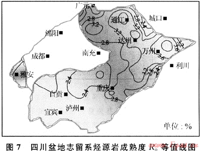 四川盆地下志留統(tǒng)泥質(zhì)烴源巖Ro值為2.2%~4.0%,已演化至過成熟階段。川南地區(qū)成熟度較低,普遍小于2.8%(圖7)。晚二疊世末,志留系源巖Ro值演化至0.9%,開始進入成油期。三疊紀之后,由于沉積速度加快,志留系埋藏速率也相應加快,志留系烴源巖在壓力和溫度作用下,熱演化加速。到中三疊世末時,很多地區(qū)的Ro值已迅速演化至1.3%。志留系烴源巖生成大量的液態(tài)烴。中侏羅世后,沉積作用仍然快速進行,志留系地層仍處于快速埋藏狀態(tài),Ro值從1.3%迅速演化至2.2%,有機質(zhì)演化至高成熟期,處于濕氣轉(zhuǎn)化階段。從白堊系開始,大部分地區(qū)的志留系烴源巖有機質(zhì)R。值都超過了3%,進入過成熟期,主要形成干氣。