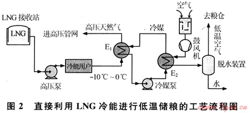 直接利用LNG的冷能來替代谷冷機生產冷空氣,工藝流程如圖2所示。LNG從接收站的大罐中抽出,然后經高壓泵增壓至7.0~8.0MPa。按照“溫度對口,梯級利用”的原則,先經保溫管線將LNG用于冷能用戶,溫度升高到0℃左右的天然氣用于低溫儲糧。在糧庫內冷媒經換熱器E1與天然氣換熱,天然氣溫度超過5℃后進入高壓天然氣管網;冷媒從10℃左右降溫到5℃左右,通過冷媒泵輸送到換熱器E2中和增壓的空氣換熱,冷媒釋放出冷能后通過管線輸送回E1,空氣吸收冷媒的冷能后溫度降低,低于10℃后,經過脫水裝置從塔底將水分離后獲得濕度適當?shù)牡蜏乜諝?,然后通入糧倉中用于糧食的通風降溫,實現(xiàn)低溫儲糧。