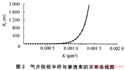 根據(jù)對不同滲流條件下的供給半徑定量研究表明(見圖2),滲透率小于1×10-3μm2的儲層,供給半徑在300m左右;當滲透率大于1.2×10-3μm2時供給半徑就明顯增加。從圖2中看出:當K介于1.2×10-3~1.4×110-3μm2,供給半徑為600~2000m;當滲透率大于等于1.4×10-3μm2,供給半徑急劇增加,供給半徑在2000m以上。這說明氣藏的非均質(zhì)性對氣井供氣范圍影響大,井網(wǎng)密度應(yīng)不一樣。沙罐坪、云和寨北區(qū)、臥龍河石炭系氣藏大部分井滲透率小于1×10-3μm2,根據(jù)計算井距在300~2000km,從目前采出程度較高、非均質(zhì)性較強的福成寨、張家場石炭系來看,井距1~2km,從理論和實際開發(fā)效果對比認為,沙罐坪、云和寨北區(qū)、臥龍河石炭系氣藏平均井距在1km左右為最好。