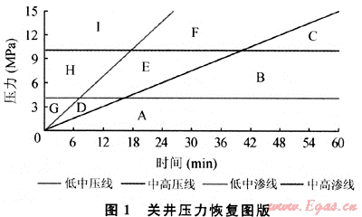 “評(píng)價(jià)點(diǎn)”的壓力值代表井底欠平衡程度,亦代表最大關(guān)井井口壓力,因此需要用幾條壓力值線來(lái)區(qū)分壓力級(jí)別[8]。從起始恢復(fù)點(diǎn)到該評(píng)價(jià)點(diǎn)的連線的斜率表示關(guān)井壓力恢復(fù)的快慢,取決于地層氣體侵入井筒能力的大小,代表著地層系數(shù)的大小。因此需要用始于起始恢復(fù)點(diǎn)的幾條不同斜率的直線來(lái)區(qū)分地層系數(shù)級(jí)別。這樣,關(guān)井壓力恢復(fù)圖版應(yīng)包括幾條壓力級(jí)別水平線和幾條地層系數(shù)級(jí)別斜線。圖1中關(guān)井壓力恢復(fù)圖版中的低中壓界限和中高壓界限為兩條水平線(壓力值分別為4MPa和10MPa),用以界定關(guān)井壓力恢復(fù)評(píng)價(jià)點(diǎn)的幅值,低中地層系數(shù)界限和中高地層系數(shù)界限為兩條斜線(斜率分別為25°、50°),用以界定關(guān)井壓力恢復(fù)的斜率,即關(guān)井壓力恢復(fù)的快慢。