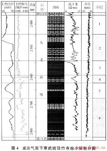 容積法估算中,依據(jù)威遠(yuǎn)氣田區(qū)筇竹寺組巖性和電性特征(圖4),在圖3基礎(chǔ)上,將威遠(yuǎn)氣田區(qū)筇竹寺組劃分為6個小層(見表4)。