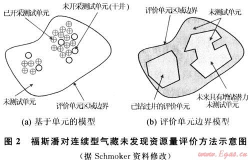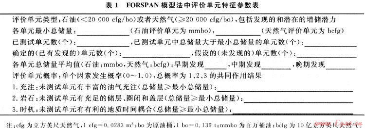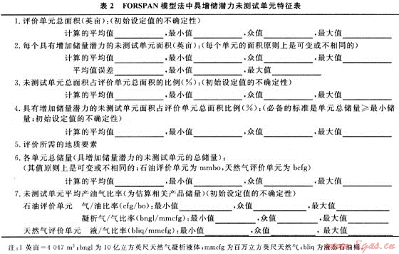 福斯潘模型(FORSPAN)法是USGS在1999年為連續(xù)型油氣藏資源評價而提出的一種評價方法。該方法以連續(xù)型油氣藏的每一個含油氣單位為對象進(jìn)行資源評價,即假設(shè)每個單元都有油氣生產(chǎn)能力,但各單元間汗油氣性(包括經(jīng)濟(jì)性)可以相差很大,以概率形式對每個單元的資源潛力作出預(yù)測。以往也用體積法對連續(xù)型油氣藏資源潛力作過評價。在體積法中,原始資源量估算常用的參數(shù)主要是一些基本地質(zhì)參數(shù)(如面積、厚度、孔隙度等),這些參數(shù)有很大的不確定性,且各單元間關(guān)系密切、缺乏獨(dú)立性。因此,參數(shù)選取及標(biāo)準(zhǔn)確定較困難。福斯潘(FORSPAN)法建立在已有開發(fā)數(shù)據(jù)基礎(chǔ)上(圖2),估算結(jié)果為未開發(fā)原始資源量。因此,該方法適合于已開發(fā)單元的剩余資源潛力預(yù)測。已有的鉆井資料主要用于儲層參數(shù)(如厚度、含水飽和度、孔隙度、滲透率)的綜合模擬、權(quán)重系數(shù)的確定、最終儲量和采收率的估算。如果缺乏足夠的鉆井和生產(chǎn)數(shù)據(jù),評價可依賴各參數(shù)的類比取值。